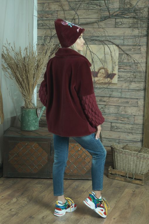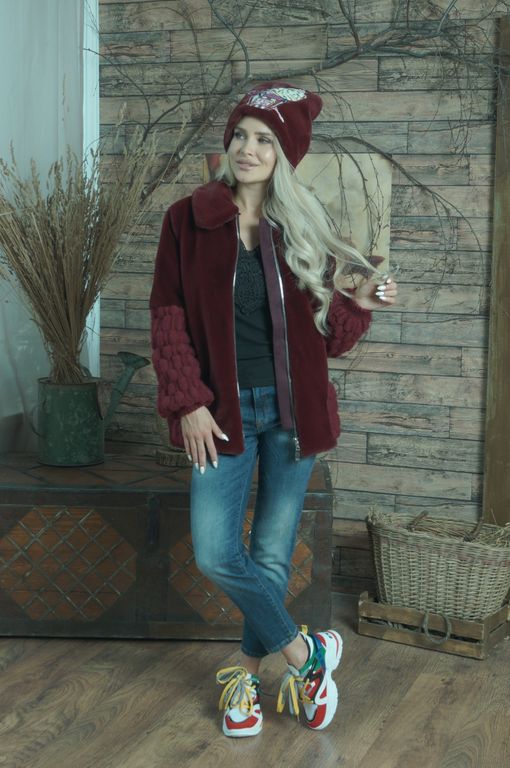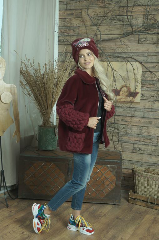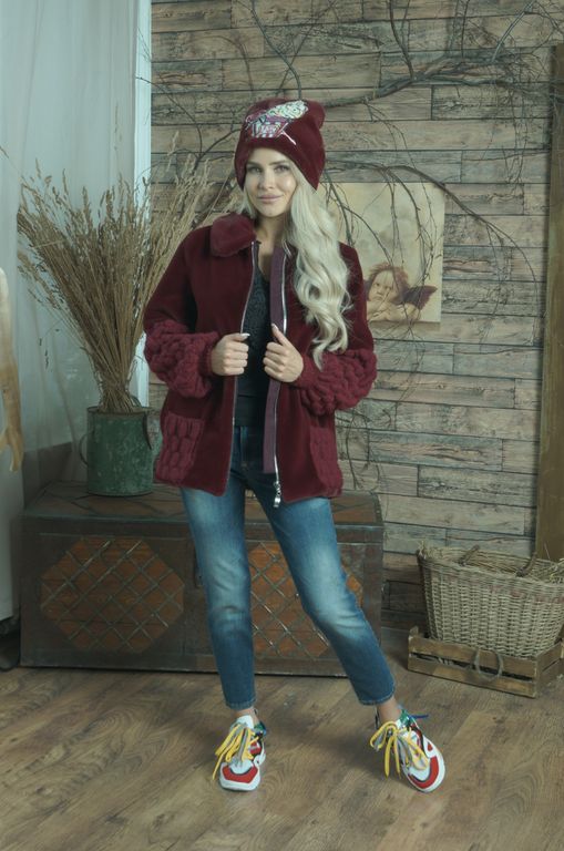 Куртка от меховой фирмы «ВЛАДИ» арт. 2532031000 выполнена из эко меха имитация кролик, высота ворса 0,8 см. С великолепной вязкой ручной работы. Доступна для заказа куртка в цвете бордовый, размер 46 без утеплителя, длина по спинке 72 см, длина рукава от плеча 64 см. Подкладка поливискоза. Пряжа шерсть 50%, акрил 50%.