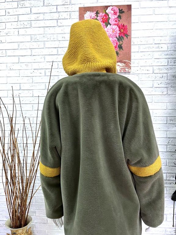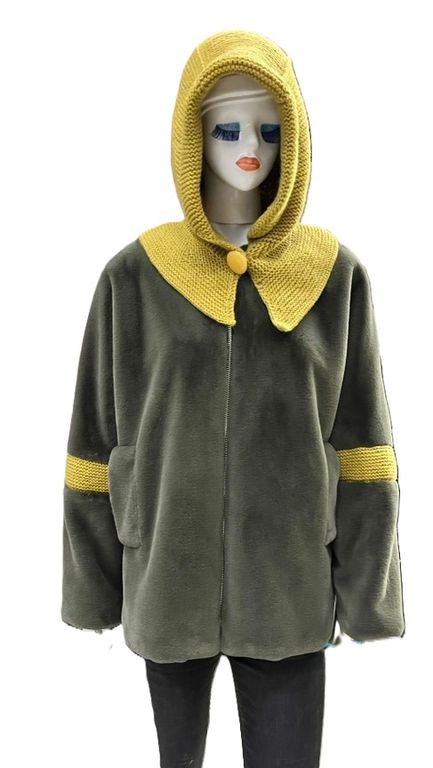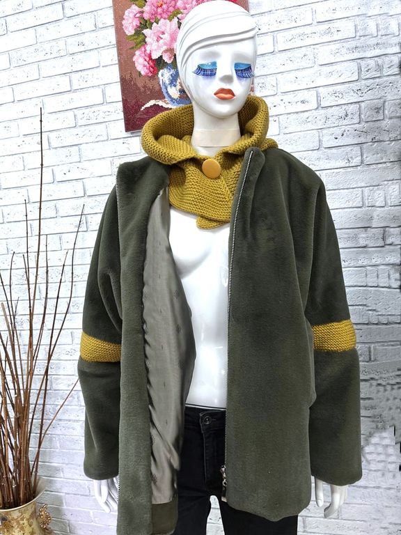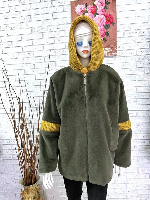 Куртка от меховой фирмы «ВЛАДИ» арт. 2530523000 выполнена из эко меха имитация кролик, высота ворса 0,8 см. Это комплект одежды: куртка и съемный капюшон, который может быть самостоятельным головным убором. Доступна для заказа куртка цвета хакки, размер 44-46, утеплитель шерстепон, длина по спинке 77 см, длина рукава от горловины 73 см. Подкладка поливискоза. Капюшон вязаный, ручная работа. Пряжа шерсть 50%, акрил 50%.