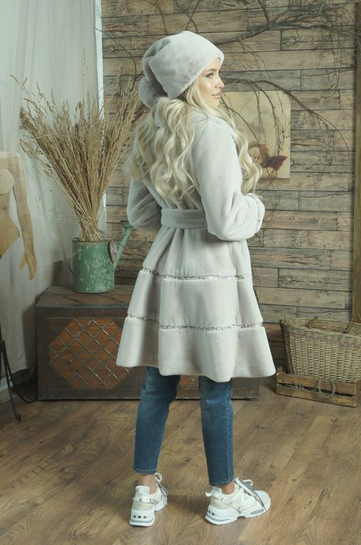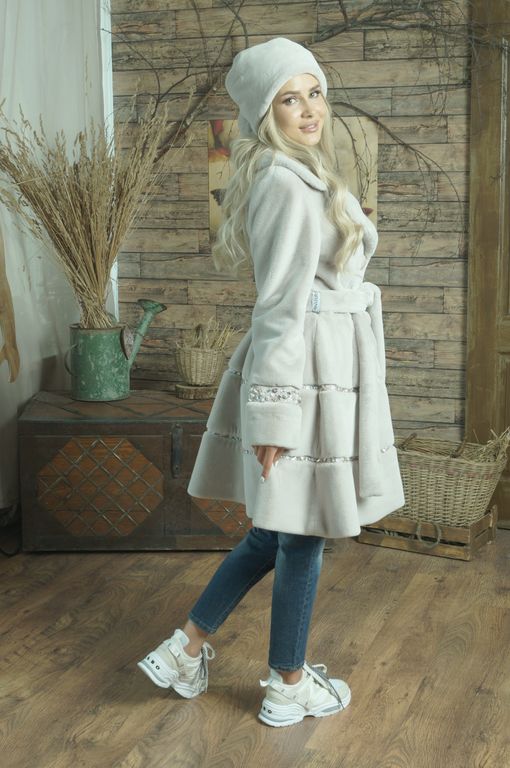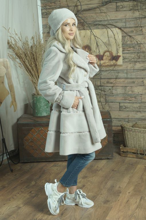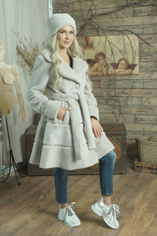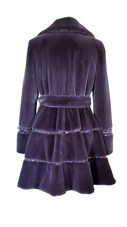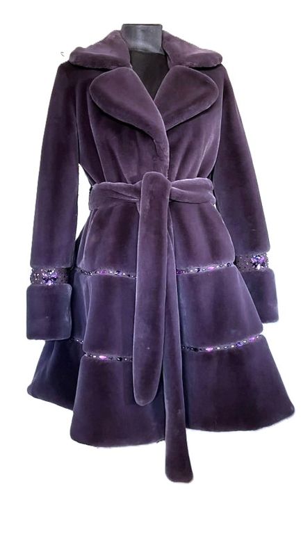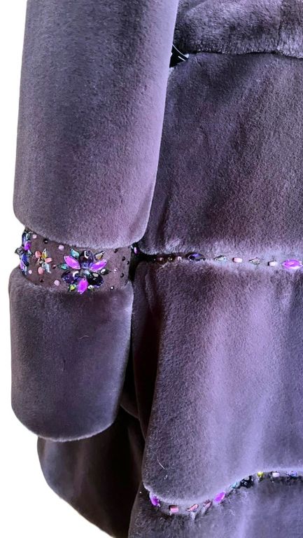 Шубка от меховой фирмы «ВЛАДИ» арт. 2530123000 выполнена из эко меха имитация кролик, высота ворса 0,8 см. Доступна для заказа шубка сиреневого цвета, размер 44-46, утеплитель шерстепон, длина по спинке 85 см, длина рукава от плеча 64 см. Подкладка поливискоза. Стразы акрил, стекло.