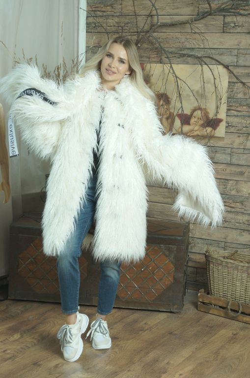 Шубка от меховой фирмы «ВЛАДИ» арт. 2531601000 выполнена из эко меха имитация лама, высота ворса до 10 см. Шуба без воротника. Роль воротника выполняет длинный и широкий шарф, на подкладке из флиса, который вы можете уложить на шее и на голове вместо головного убора по своему вкусу. Доступна для заказа шубка белого и черного цвета, размер 44-46, без утеплителя, длина по спинке 85 см, длина рукава от плеча 58 см. Подкладка поливискоза.